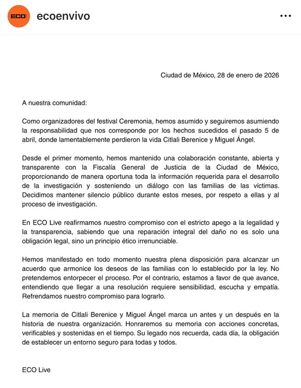 Finalmente, ECO Live aseguró que la muerte de Citlali Berenice y Miguel Ángel representa un punto de quiebre en la historia de la organización. Afirmó que honrará su memoria mediante acciones concretas y verificables, orientadas a reforzar la seguridad en sus eventos. El mensaje central es claro: la tragedia dejó una lección que obliga a garantizar entornos seguros para todas las personas que asisten y trabajan en espectáculos públicos.